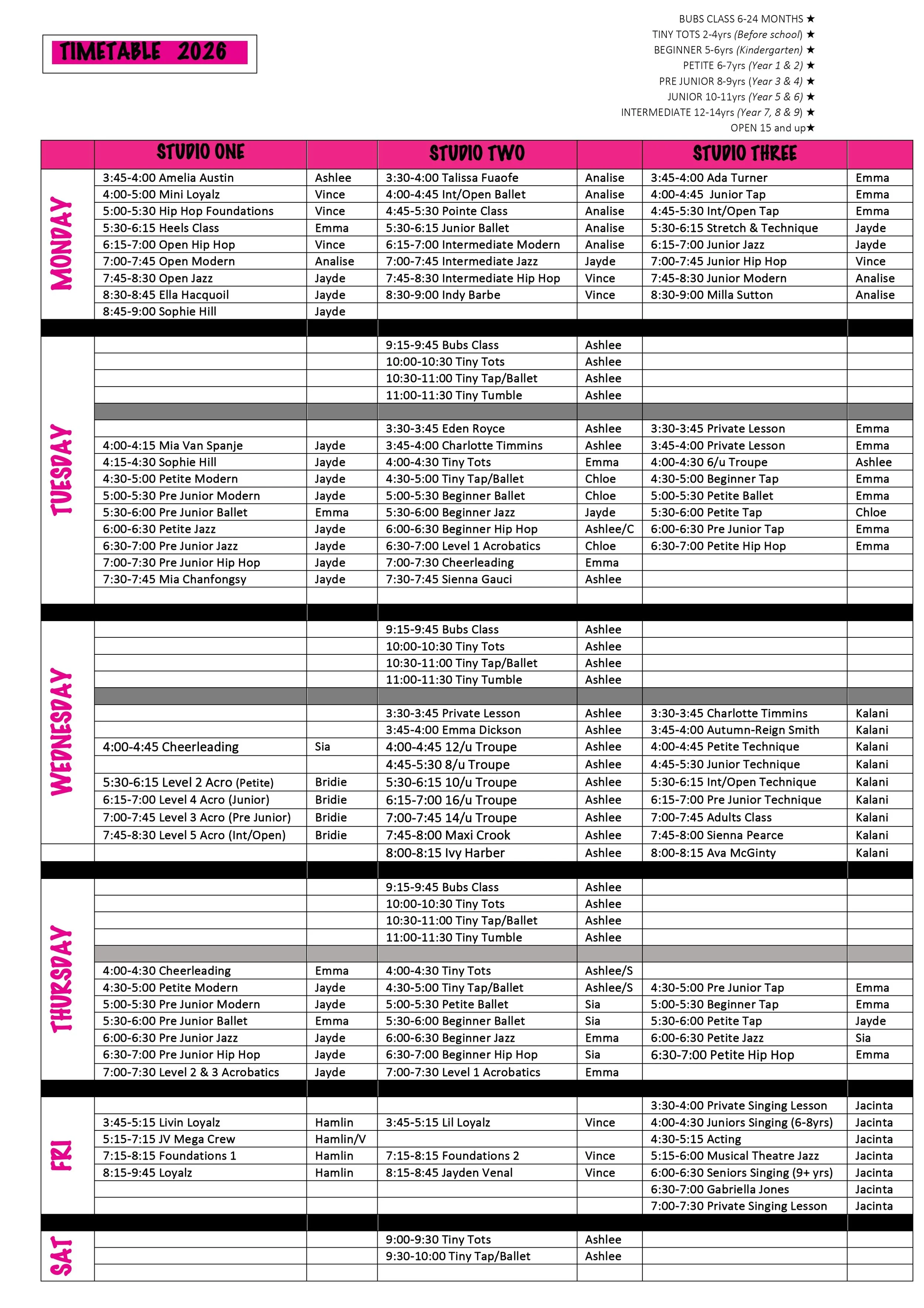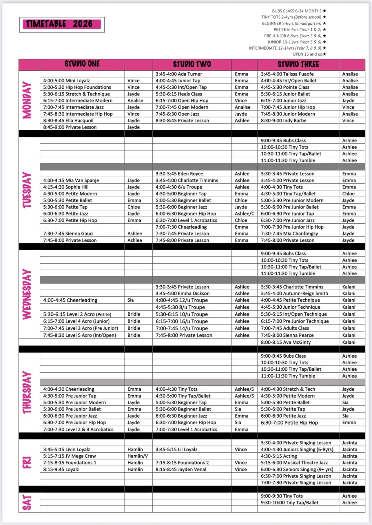 2026 timetable Download age group timetables Tiny tots (pre school) Beginner (kindergarten) petite (years 1-2) pre junior (years 3-4) junior (years 5-6) intermediate (years 7-9) open (ages 15+)